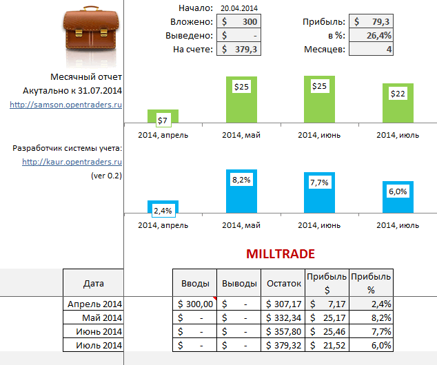 за Июль 2014 +38.3$ (+7.7% ), за все время (4 мес.) +108.5$ (+25.2%)